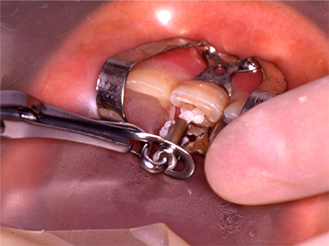 その後、1800年代後半から1900年代前半にかけて、さまざまな薬剤を用いた歯の漂白法が発表されましたが、1963年にNuttingとPoeが30%過酸化水素水と過ホウ酸ナトリウムという成分をペースト状にして歯髄腔(歯の神経が入っていた空洞)の中に貼付する術式を確立しました。この方法はウォーキングブリーチ法と呼ばれ、半世紀以上を経た今日でも失活歯漂白法の基本とされています。