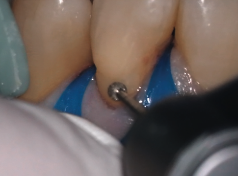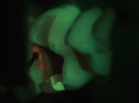 手術顕微鏡で拡大した視野下にて歯石・歯垢が付着している箇所は赤色、正常な部位は緑色となるため、カリエスリスクの高い箇所の識別を補助し、処置前後のインフォームドコンセントや治療を効率的に行うことができます。