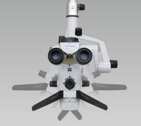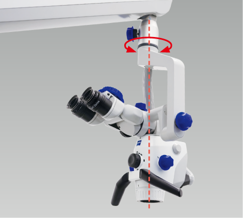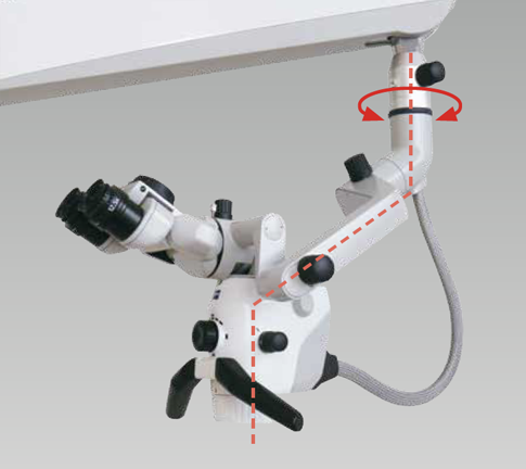 OPMI picoシリーズに搭載し、歯科用手術顕微鏡のゴールドスタンダードともいえるMORAインターフェースはEXTARO 300にも搭載可能です。MORAインターフェースは顕微鏡鏡基部を左右に振っても、術者が覗いている鏡筒部分は常にまっすぐに保つことができます。これにより背筋をのばした姿勢を維持することができ、長時間にわたる治療でも術者への負担が低減されます。
