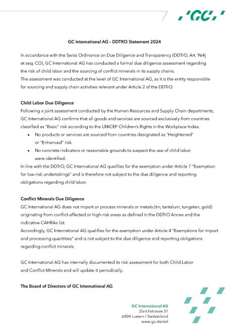 In accordance with the Swiss Ordinance on Due Diligence and Transparency (DDTrO, Art. 964j et seq. CO), GC International AG has conducted a formal due diligence assessment regarding the risk of child labor and the sourcing of conflict minerals in its supply chains.