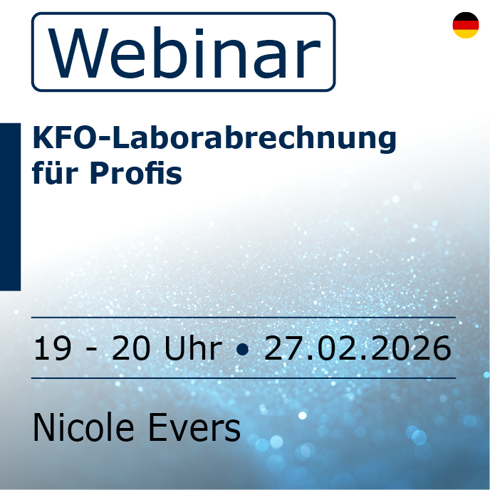 „KFO-Laborabrechnung für Profis“ vermittelt den Teilnehmern die unterschiedlichen Möglichkeiten der Laborabrechnung nach BEL und BEB. Ziel ist es, eine korrekte Auftragsvergabe sowie eine vollständige Abrechnung der erbrachten Laborleistungen in der Praxis zu gewährleisten.