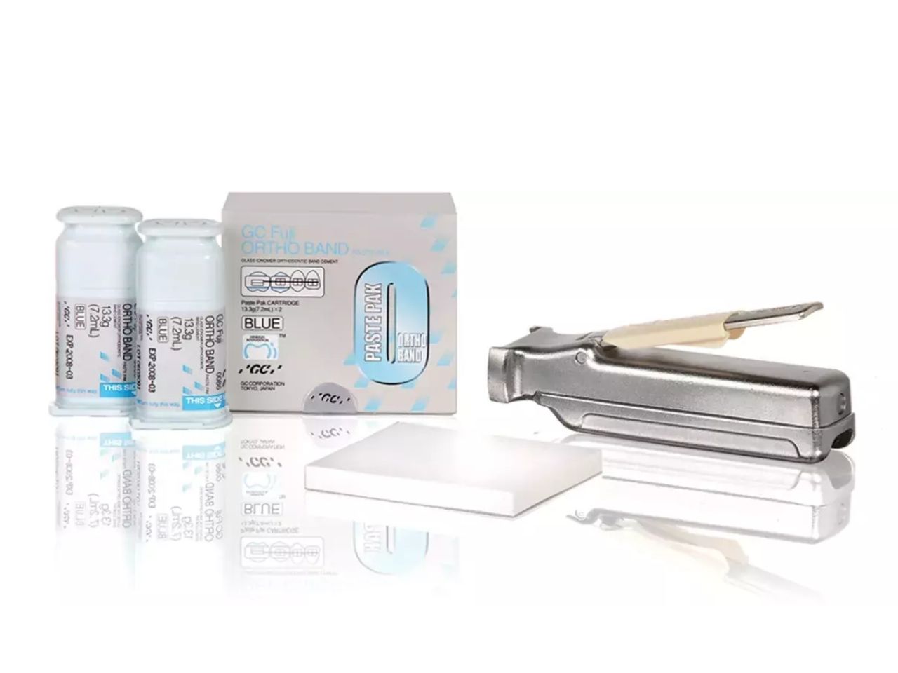 GC Fuji ORTHO BAND is a blue, resin modified glass ionomer for bonding orthodontic bands. It can also be used for the cementation of appliances retained with stainless steel crowns (ex: Herbst or expansion appliances).