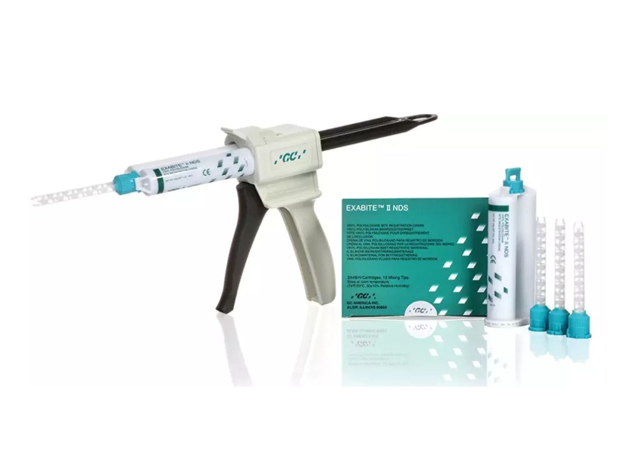 EXABITE II NDS is an improved, addition reaction Vinyl Polysiloxane (VPS) impression material that has significant handling and accuracy advances, extrudes easier, and sets hard very quickly. This product was developed especially for occlusal registrations.