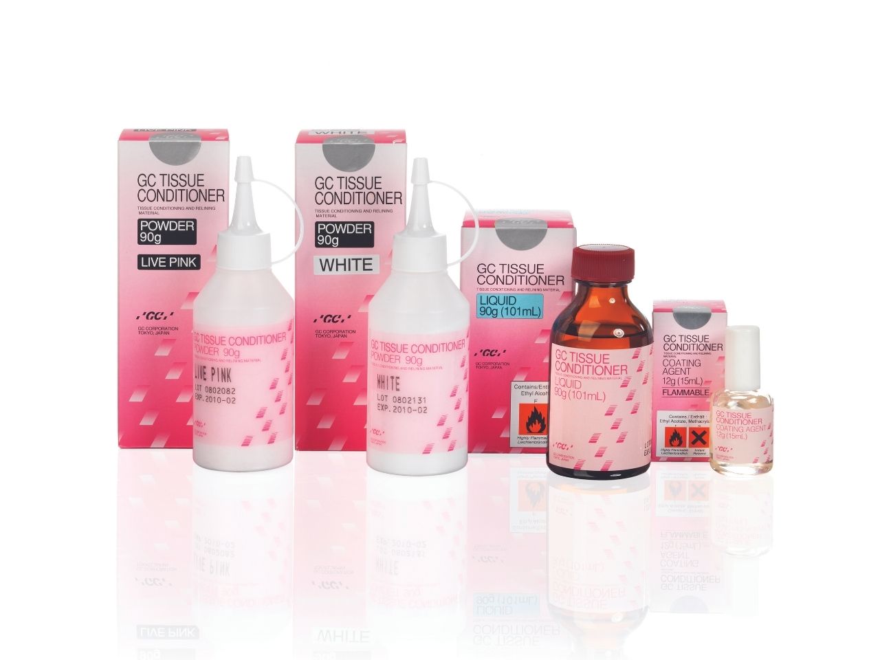 | 0128F103-0010 | GC Tissue Conditioner 1-1 PKG (Live Pink) - Contains: one (90g) bottle of powder, one (90g) bottle of liquid, one (12g) bottle of Coating Agent and accessories. |